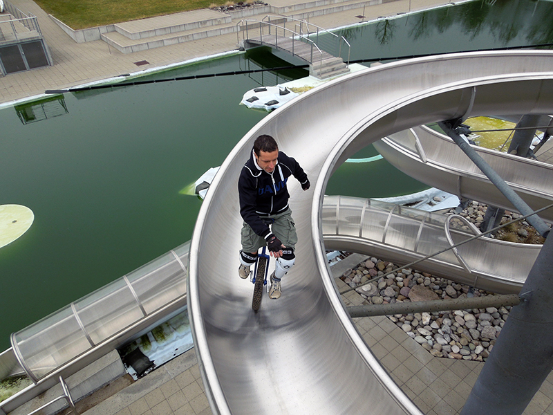 „David Wieser ist 33 Jahre alt und gelernter Landmaschinen-Mechaniker. Wenn gerade nicht auf dem Einrad unterwegs, arbeitet er als Badmeister in Frick (AG). Von 2009 – 2011 war David auf einer Weltreise, während der er in Australien auf einer Farm und in Namibia auf einer Lodge arbeitete.