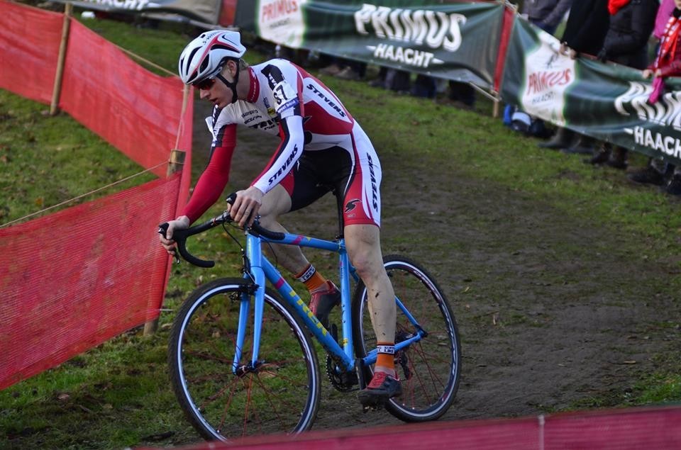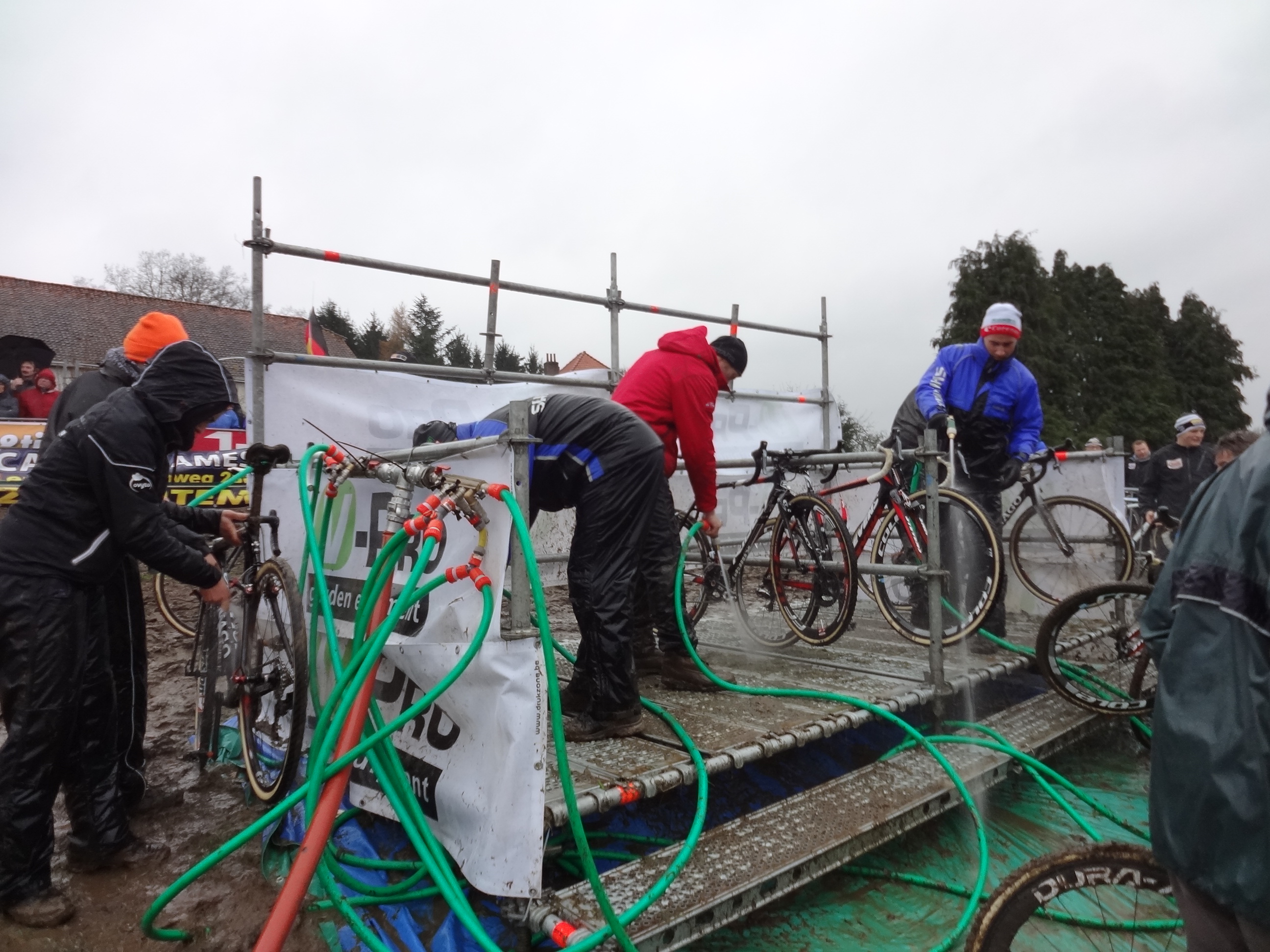 Ein saftiges Fleisch mit einem belgischen Bier zum Abendessen gab neue Motivation für den Sonntag. Der Wetterbericht versprach schönes Radquerwetter – also Regen und kalt. Nach längerer Parkplatzsuche erreichten wir den Rennplatz. Die Pfützen am Boden hatten eine Eisschicht, der Wind wehte unaufhörlich und die dunklen Wolken versprachen ein dreckiges Rennen. Der Start-/Zielbereich lag mitten im Dorf Overijse, und schmierige Kopfsteinpflaster und eine sumpfige Wiese lockten noch mehr Zuschauer an als gestern. Der Streckenteil im Wald war eher technisch und weniger verspielt als gestern. Und Gott sei Dank keine Sandpassagen mehr!