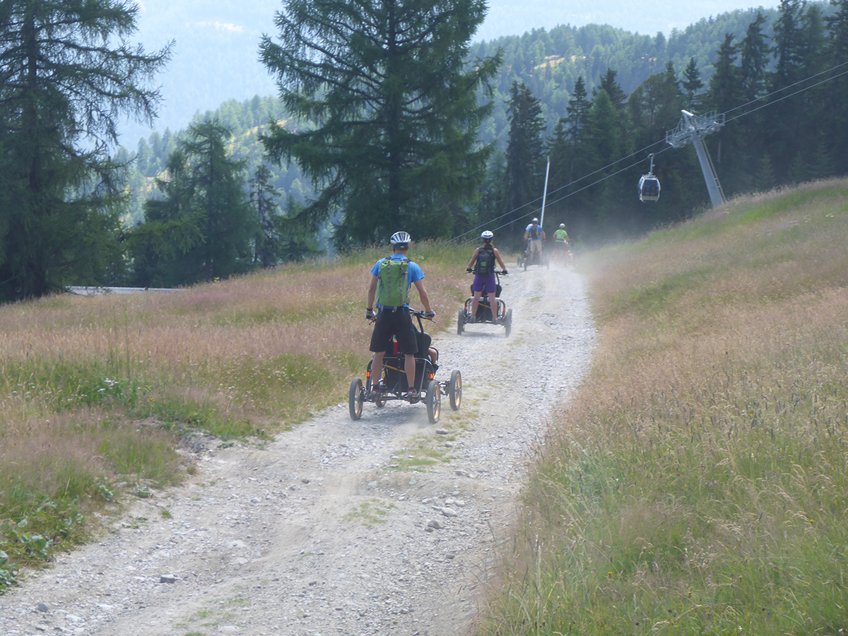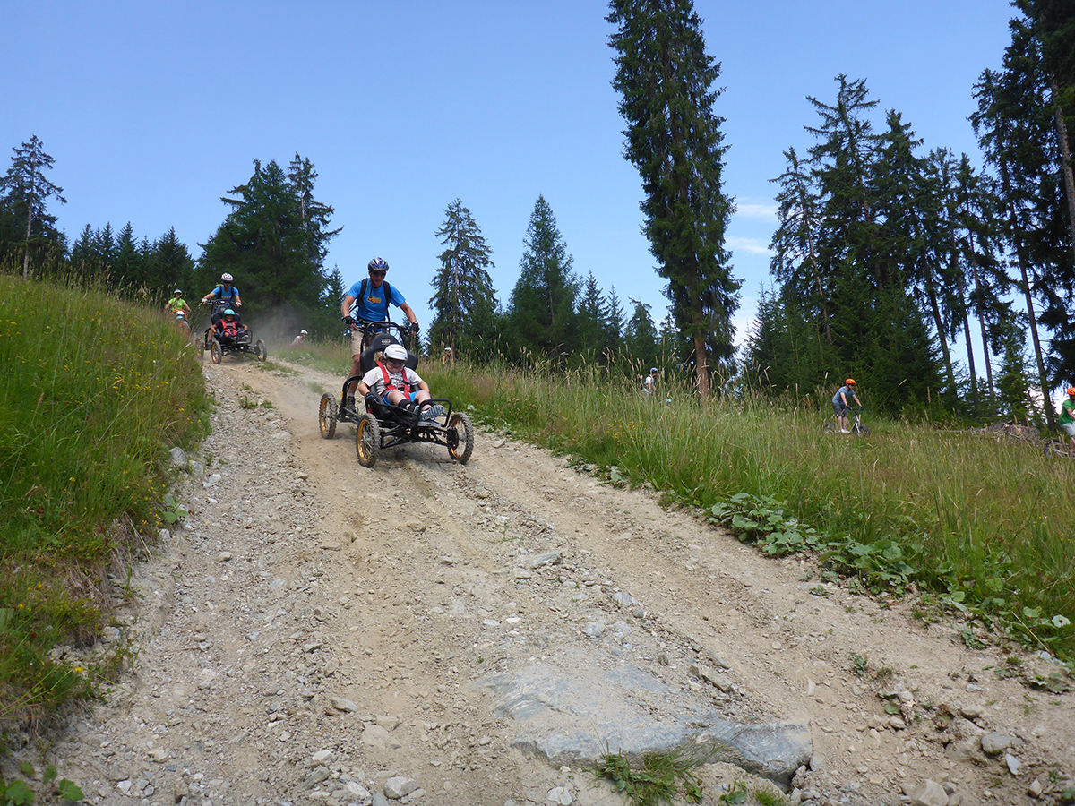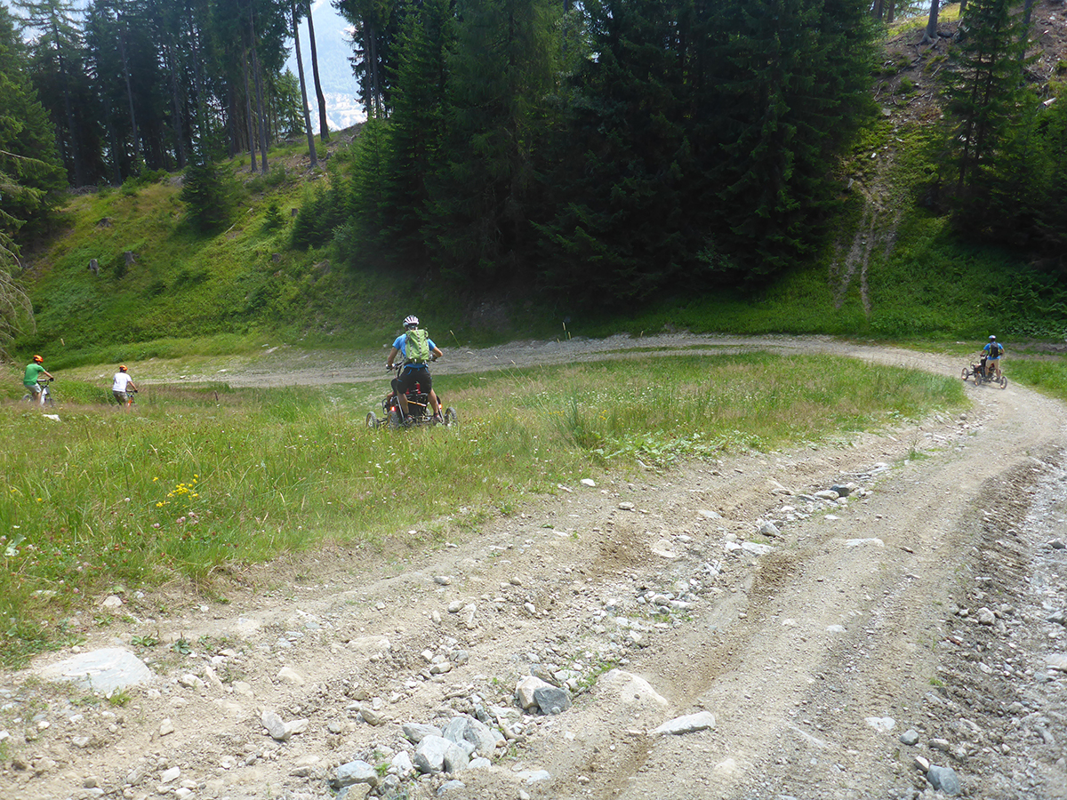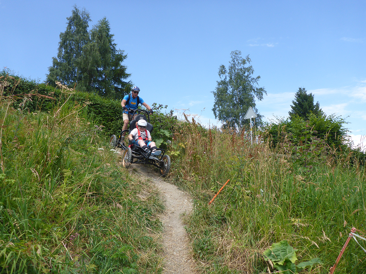 Der so genannte Cimgo ist ein nicht motorisiertes Bergabfahrgerät, das eine behinderte Person und seinen Piloten auch durch sehr steile Passagen ein sicheres und bequemes Runterfahren ermöglicht. Man kann es also mit einem Tandem-Mountainbike vergleichen, mit dem man allerdings nicht treten kann, sondern das im flachen Gelände geschoben werden muss.