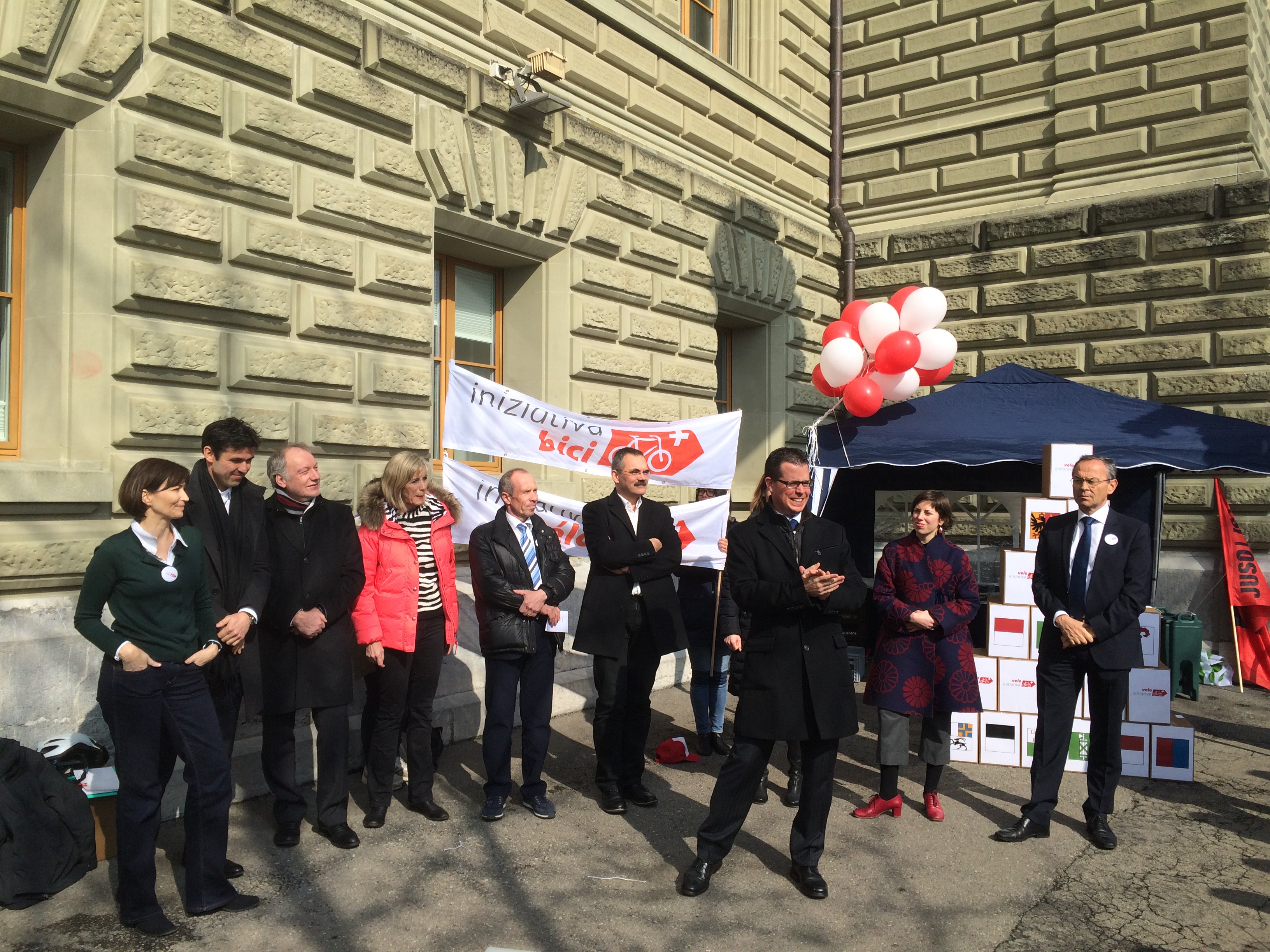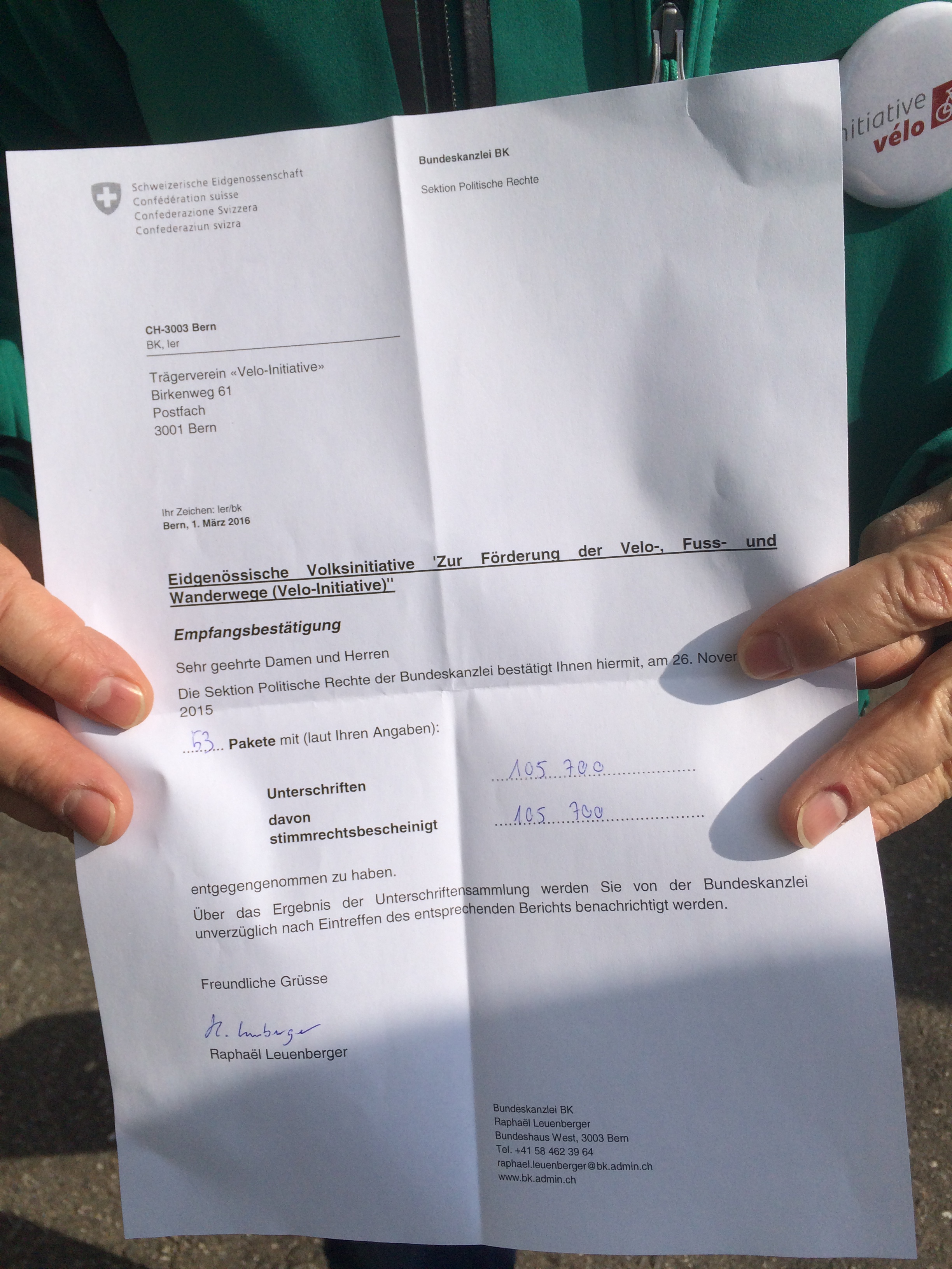Am 1. März war es endlich so weit: Die erforderlichen 100’000 Unterschriften für die Velo-Initiative wurden bei der Bundeskanzlei in Bern eingereicht. Die Unterschriften kamen in weniger als einem Jahr zusammen – zweifellos ein Beleg dafür, dass die Anliegen der Initianten einem Bedürfnis der Bevölkerung entspricht.