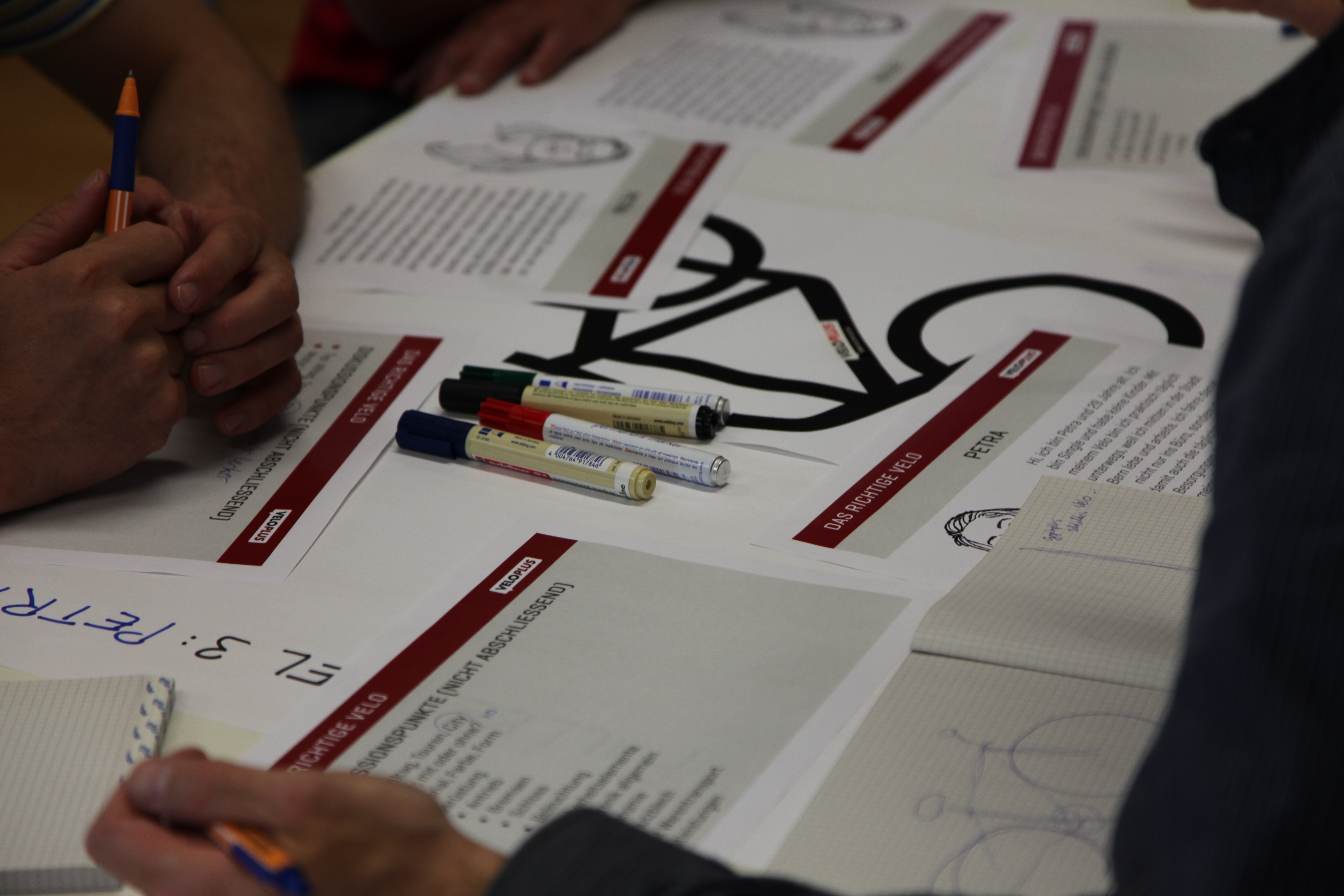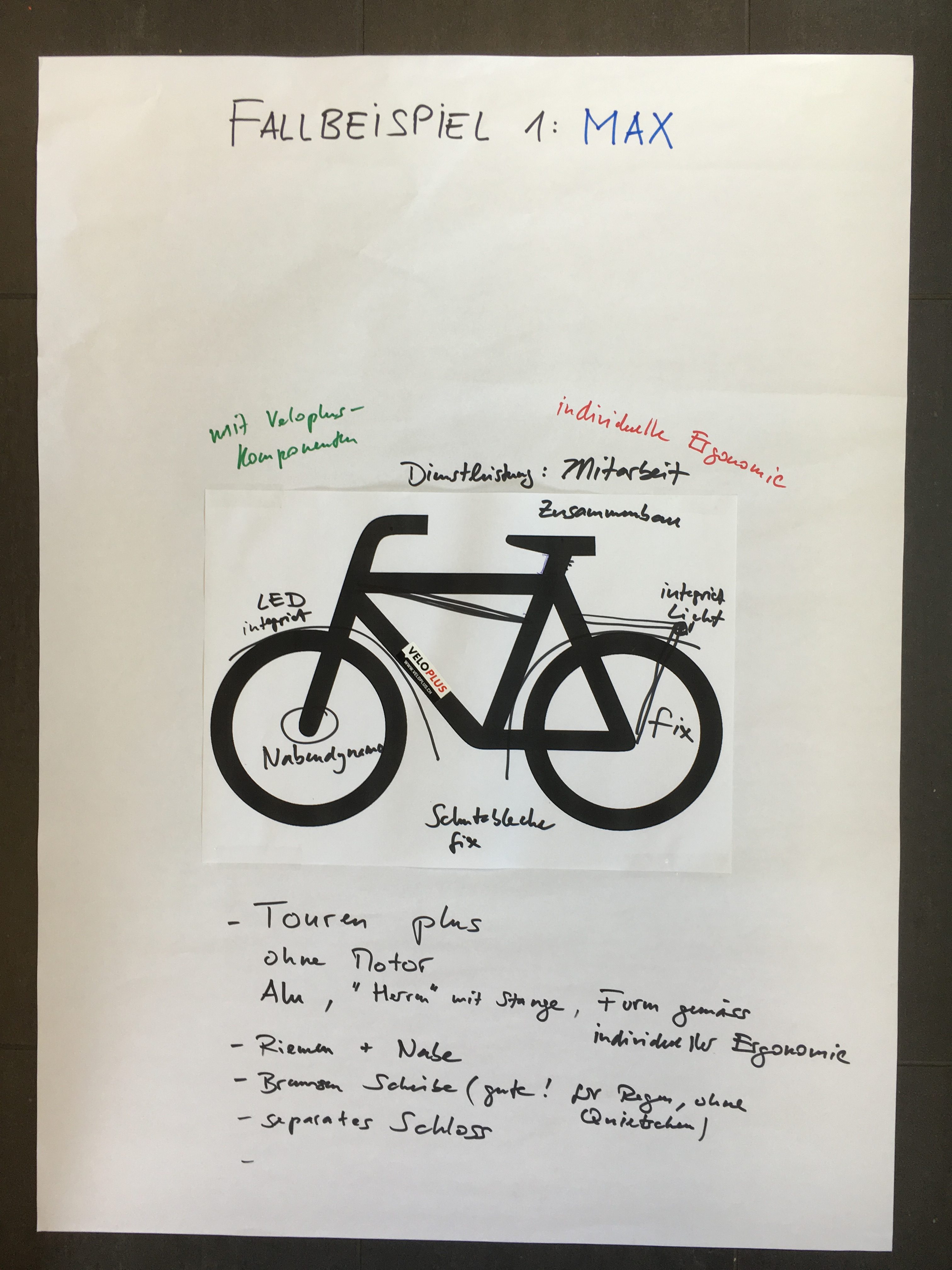 Somit hatten alle Teilnehmenden eine gemeinsame Basis für den darauffolgenden Workshop, bei dem in Gruppen von drei Fallbeispielen ausgehend versucht wurde ein Velo zu gestalten: Max (ein regelmässiger Berufspendler), Moritz (ein dreifacher Familienvater und gelegentlicher Pendler) und Petra (eine jugen Frau, die mitten in der Stadt lebt und arbeitet).