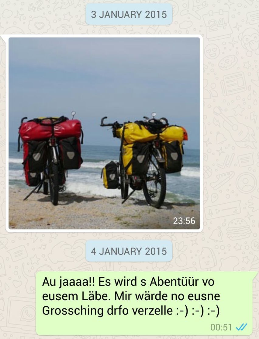 Angefangen hat alles mit einem simplen Foto, über welches ich, Siria, Traveler No.2 oder auch OT Grippo (OT=Organisationstalent) genannt, im Internet gestolpert bin und Nicholas, aka Windschattenfahrer, wortlos via Whats-App zukommen liess: Zwei vollbepackte Tourenräder mit atemberaubender Kulisse im Hintergrund.