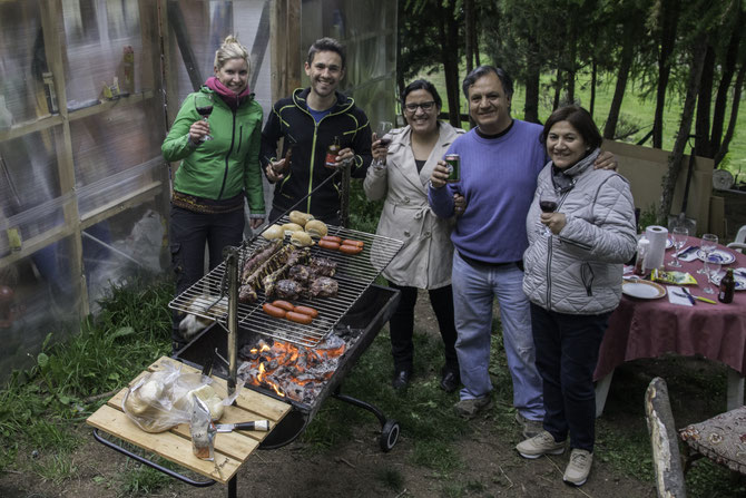 In Coyhaique, der Hauptstadt der Region, kamen wir über die Organisation „Airbnb“ bei Gabriela und Mario unter. Durch Airbnb können Leute ihre Wohnungen gegen ein kleines Entgelt mit Reisenden teilen oder ihnen komplett zur Verfügung stellen. So wurden wir in ihrem Haus inmitten im Grünen aufs Herzlichste empfangen. Bei ihnen verbrachten wir drei gemütliche Tage, wobei sie am letzten Abend sogar ein „Asado”, ein typisch chilenisches Grillfest, für uns organisierten. Man isst viel Fleisch, mit… viel Fleisch. Über unsere Frage nach Beilagen blickten wir in überraschte Gesichter. Das scheint man bei Grilladen echt nicht zu kennen. Was dafür natürlich nicht fehlen darf, ist wiederum der Wein.