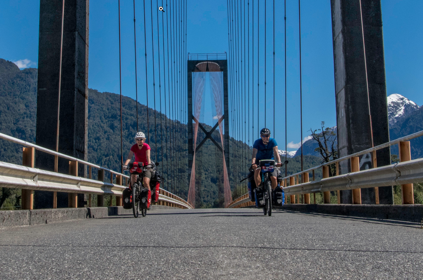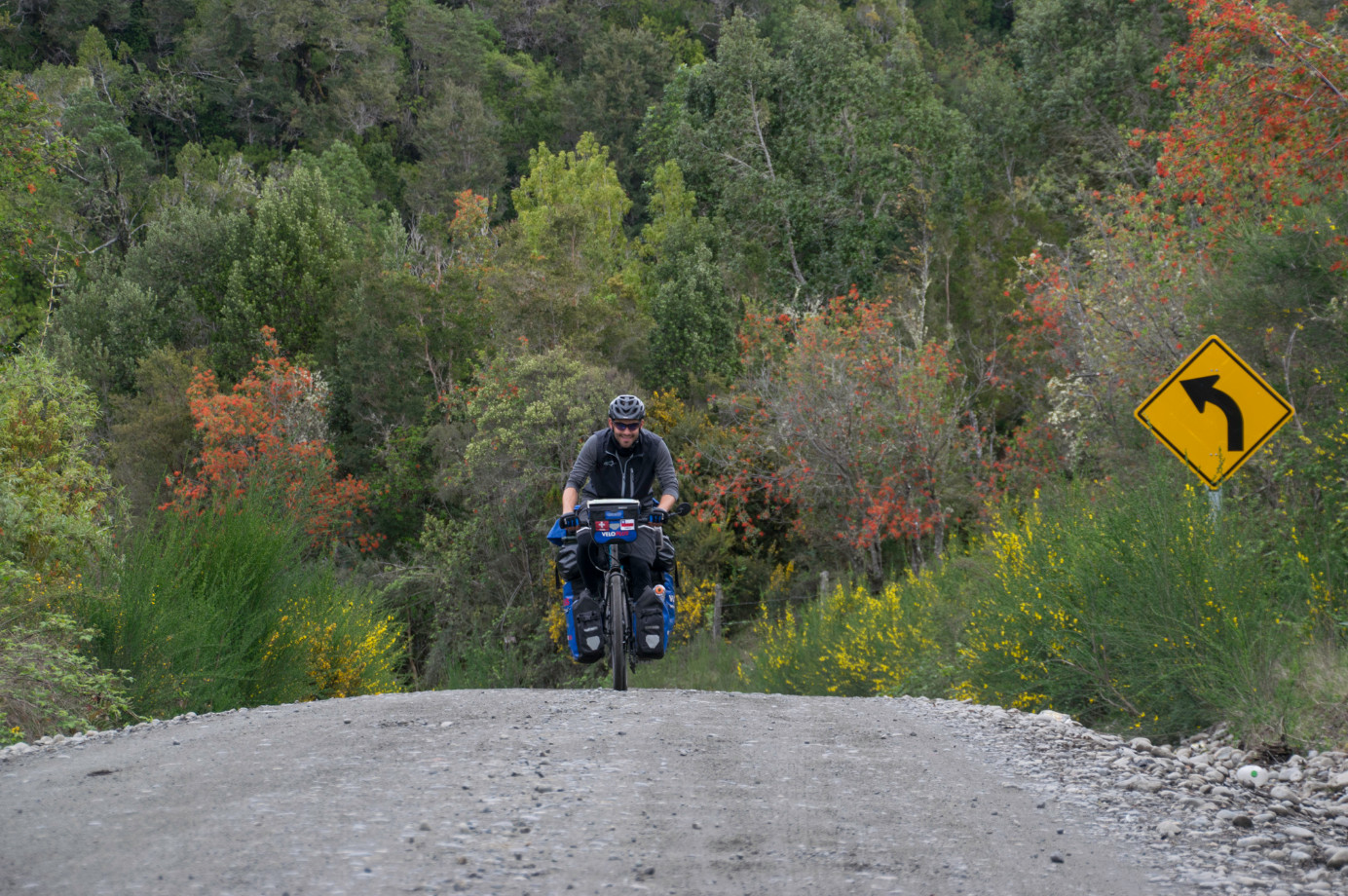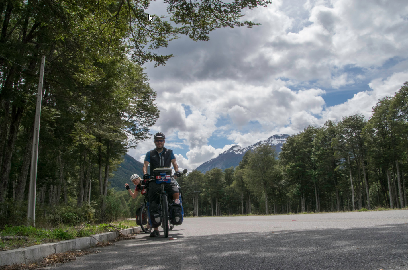 Auf der Carretera Austral warteten zwar wiederum anstrengende Abschnitte, jedoch auch spektakulärste Landschaften auf uns. Schon auf den ersten Kilometern, wo wir zu unserem Glück bereits von der laufenden Asphaltierung profitieren konnten, waren wir von der Natur beeindruckt. Zunächst führte unser Weg durch ein bewaldetes Gebiet, wobei ab und an schneebedeckte Bergspitzen hinter den Baumwipfeln hervorlugten. Manchmal konnte man an einem bläulichen Schimmern auch erkennen, dass der Berg vergletschert war. Kurz vor einem kleineren Pass verliessen wir den angenehmen Untergrund. Von da an ging es auf einer Schotterpiste weiter, die sich stückweise vom parallel dazu verlaufenden Flussbett nur dadurch unterschied, dass kein Wasser floss. Der Untergrund war mit grossen, losen Steinen übersät, sodass wir wieder einmal nur im Schritttempo vorwärtskamen oder sogar schieben mussten. Als wir uns einem Fjord näherten, wurde die Strasse wieder besser und wir konnten über mehrere Stunden direkt dem Meeresufer folgen. Dabei gelangten wir abends zu einem offiziellen Zeltplatz mit eigenem Strand. Als grosses Highlight erspähten wir am nächsten Morgen direkt nach dem Frühstück eine Gruppe Delfine, die sich in unmittelbarer Strandnähe munter vergnügte.