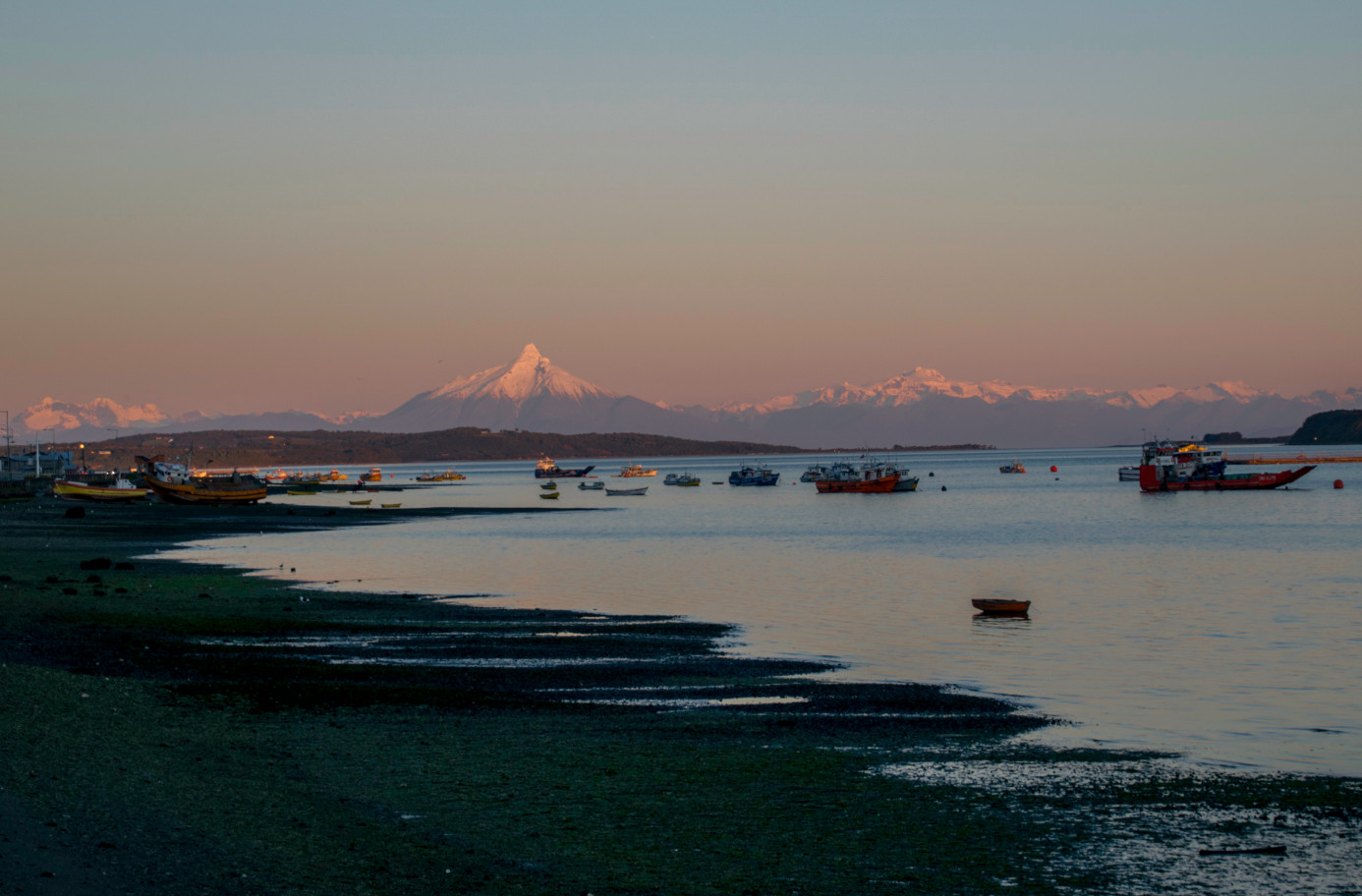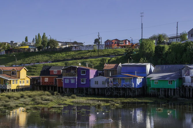 Das Warten auf besseres Wetter in Puerto Varas hat sich gelohnt. Zwar war der Himmel noch grau und verhangen, als wir uns auf unsere Räder schwangen, doch schon bald lichtete sich die Wolkendecke. Bei unserer Ankunft auf der Insel „Chiloé” wurden wir bereits mit Sonnenstrahlen begrüsst, die uns die kommenden Tage treu begleiteten. Wir hatten grosses Wetterglück, denn Chiloé gehört zu den regenreichsten Regionen der Welt, und scheinbar herrschte bis zu unserem Ankunftstag zwei Wochen Dauerregen. Auf der Insel erwartete uns eine wundervolle Landschaft mit saftigen Wiesen, kräftig blühenden Sträuchern, malerischen Seen und immer mal wieder boten sich uns beeindruckende Ausblicke auf den Ozean. Teilweise konnte man sogar die schneebedeckten Vulkane auf dem Kontinent im Hintergrund erkennen. In den kleinen, für die Insel so typischen Dörfchen gruppierten sich bunt bemalte Holzhäuschen um eine ebenso farbige Holzkirche.