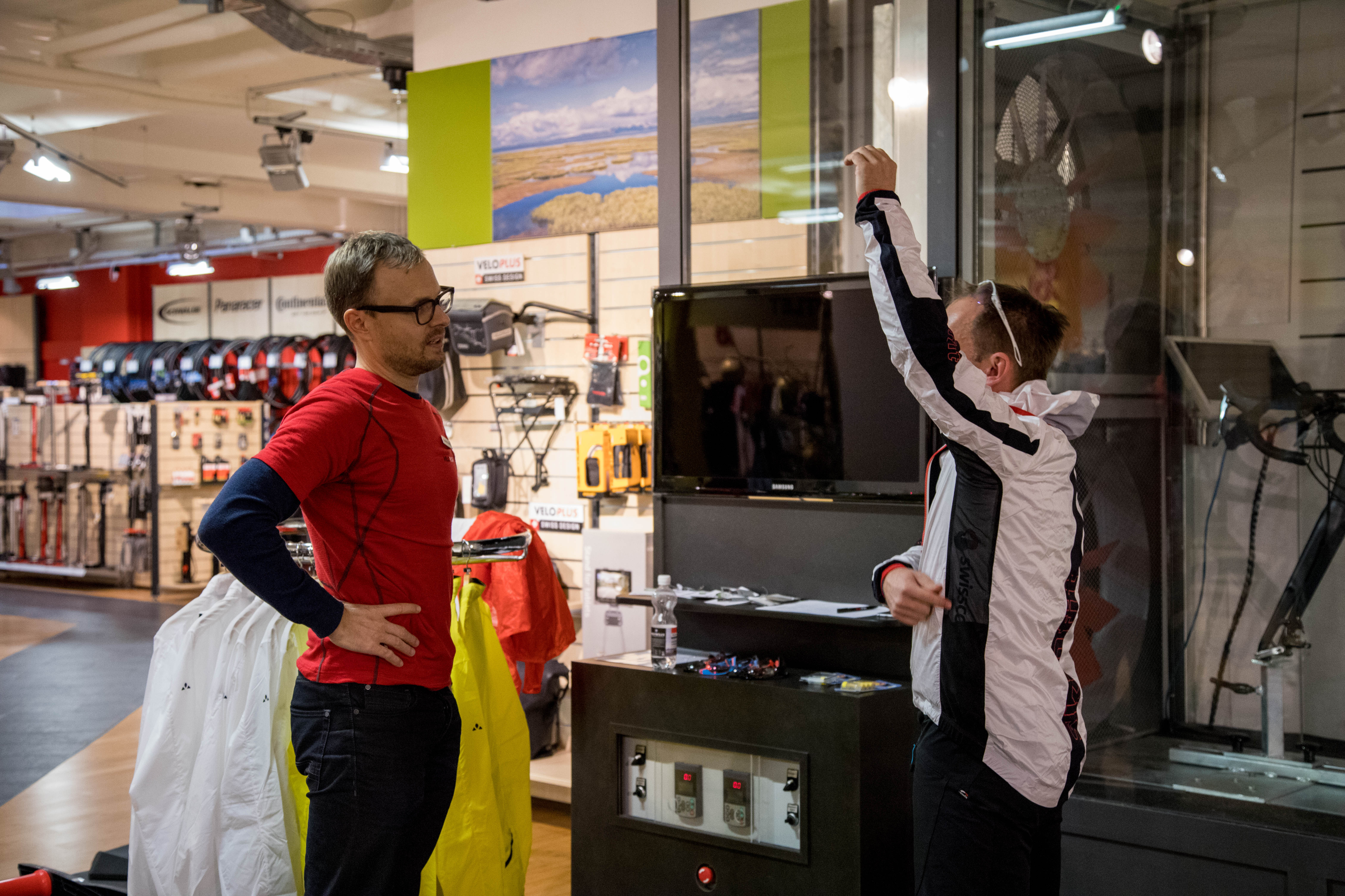 Nach einer kurzen Begrüssung durch Dominique Metz gab Produktmanagerin Barbara Pfister einige technische Inputs betreffend Bekleidung und Materialien im Allgemeinen. Nach diesem „Theorie-Block“ gings nun endlich ans Testen. An vier unterschiedlichen Posten haben die Teilnehmerinnen und Teilnehmer Jacken und Gilets angefasst, angezogen und auf Herz und Nieren geprüft. Highlight war natürlich der wilde Ritt im Aeolus-Windkanal. An den vier Posten haben wir uns fleissig Notitzen gemacht. Sowohl Schnitt, als auch Grössen, Verpackungsmöglichkeiten, Materialien und Besonderheiten wurden genau unter die Lupe genommen und dem Härtetest unterzogen.