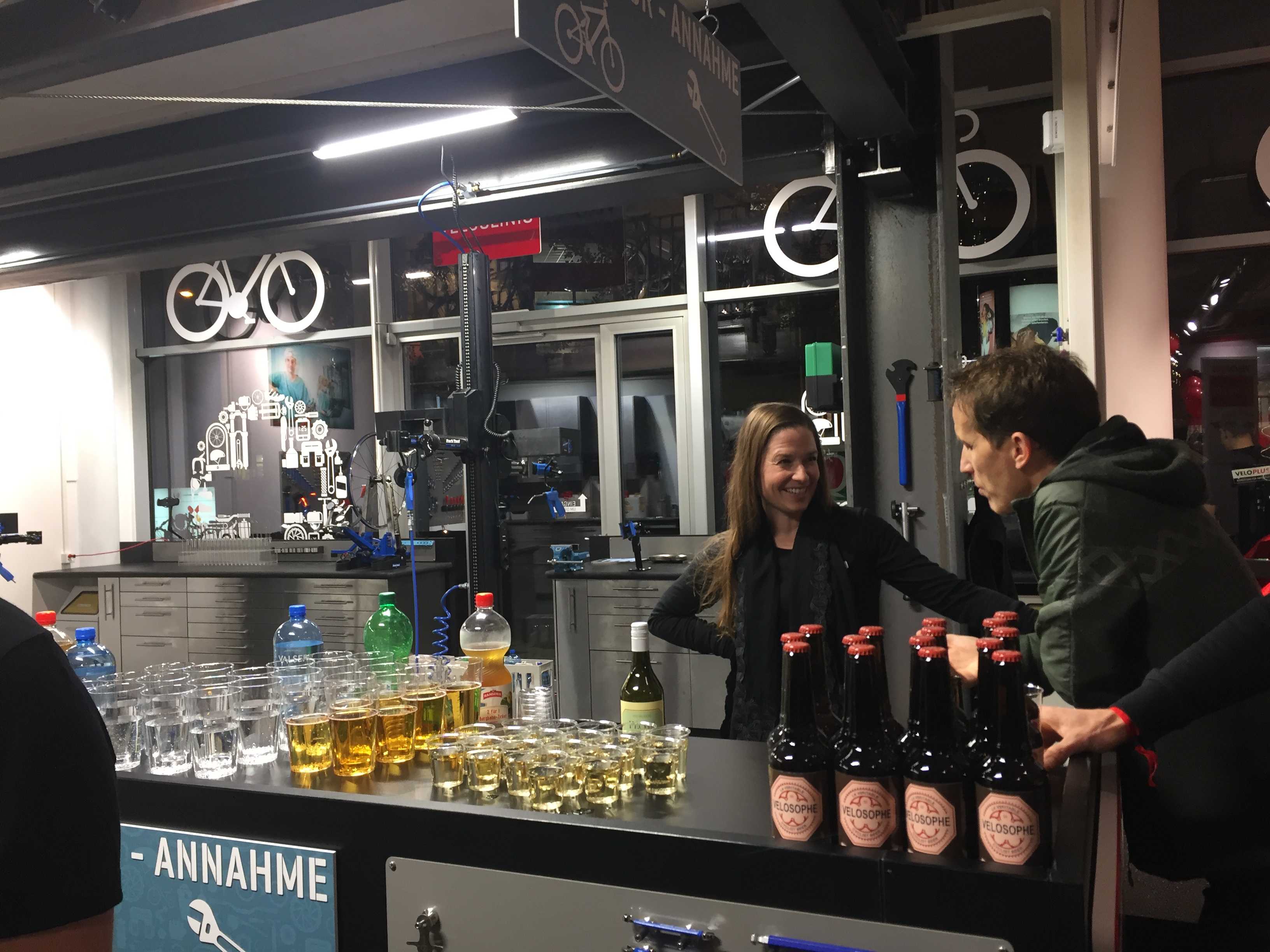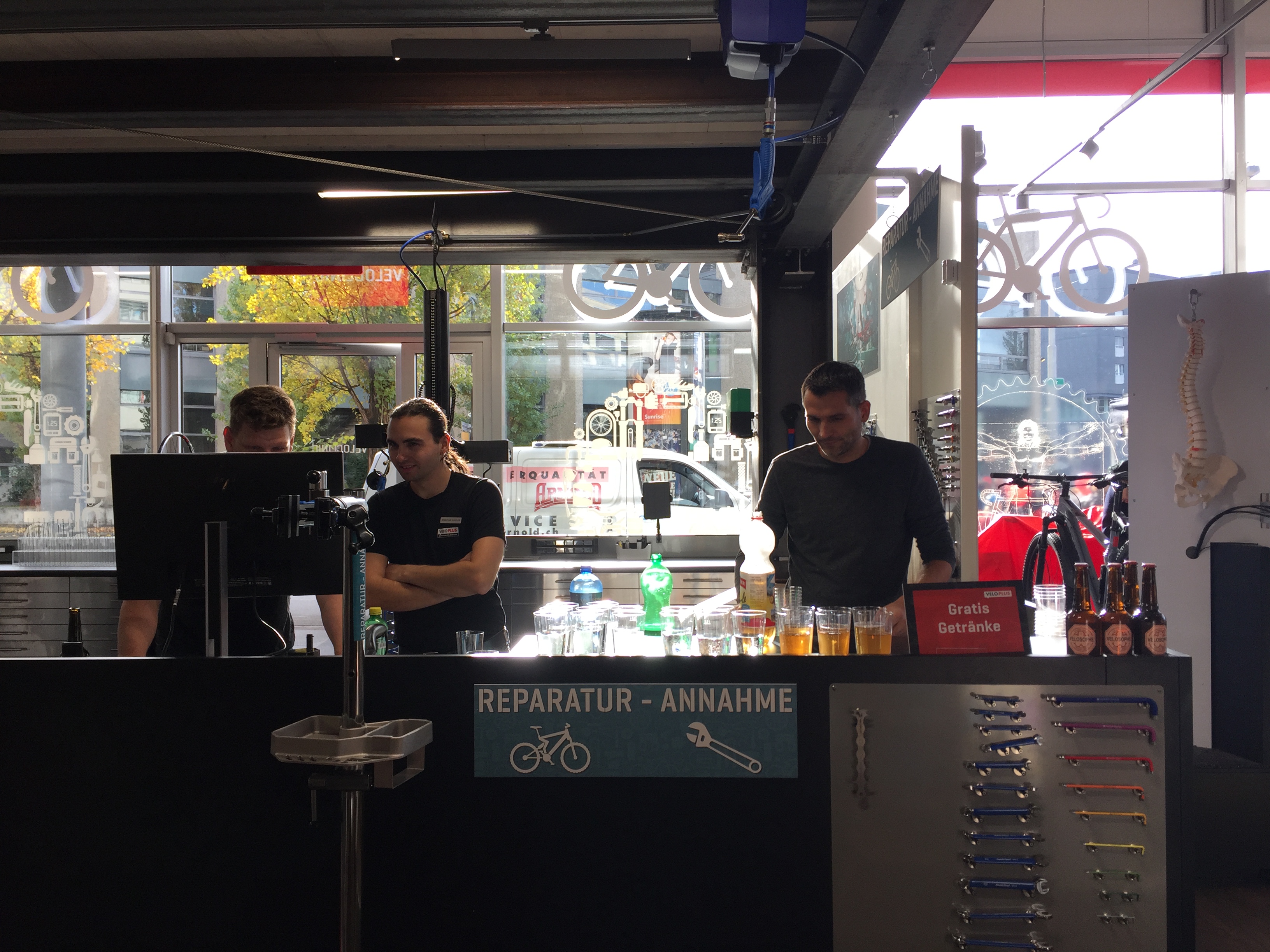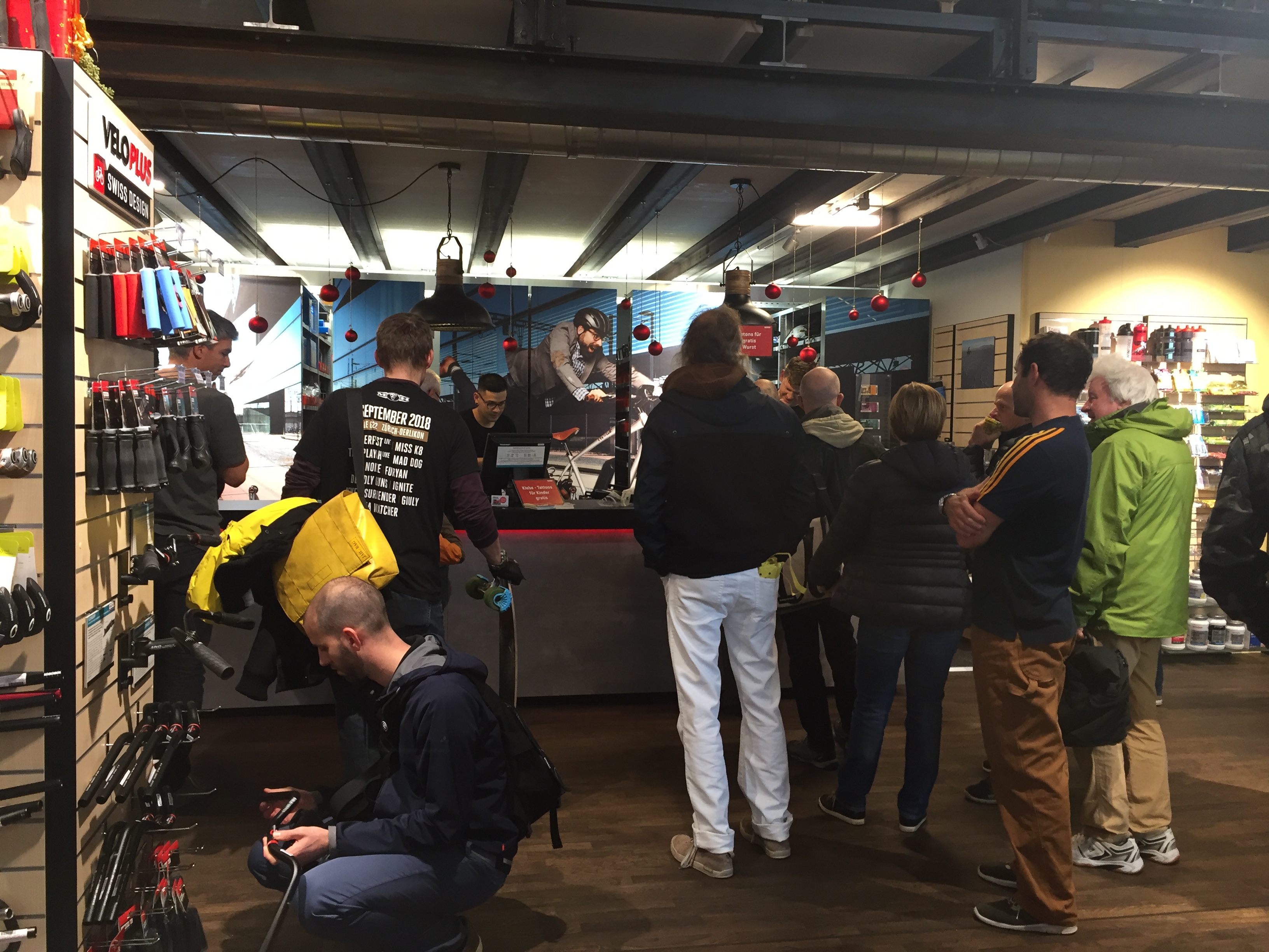 Am nächsten Tag ging es Schlag auf Schlag weiter. Um punkt 10.00 Uhr haben wir unsere Türen ganz offiziell für alle Veloplus-Kunden aufgemacht. Bereits nach wenigen Minuten war der Laden an der Binzmühlestrasse 80 voll und das Verkaufspersonal hatte alle Hände voll zu tun. Es wurde beraten, informiert und über den neuen Laden gesprochen. Wer eine Stärkung brauchte, konnte sich bei uns an der Veloclinic-Bar bedienen oder eine Wurst vom Grill holen. Auch hier war der Andrang gross. Alle Gäste haben sich aber gerne die Zeit genommen und sind sowohl für eine Wurst wie auch für ein Bier gerne etwas länger angestanden.
