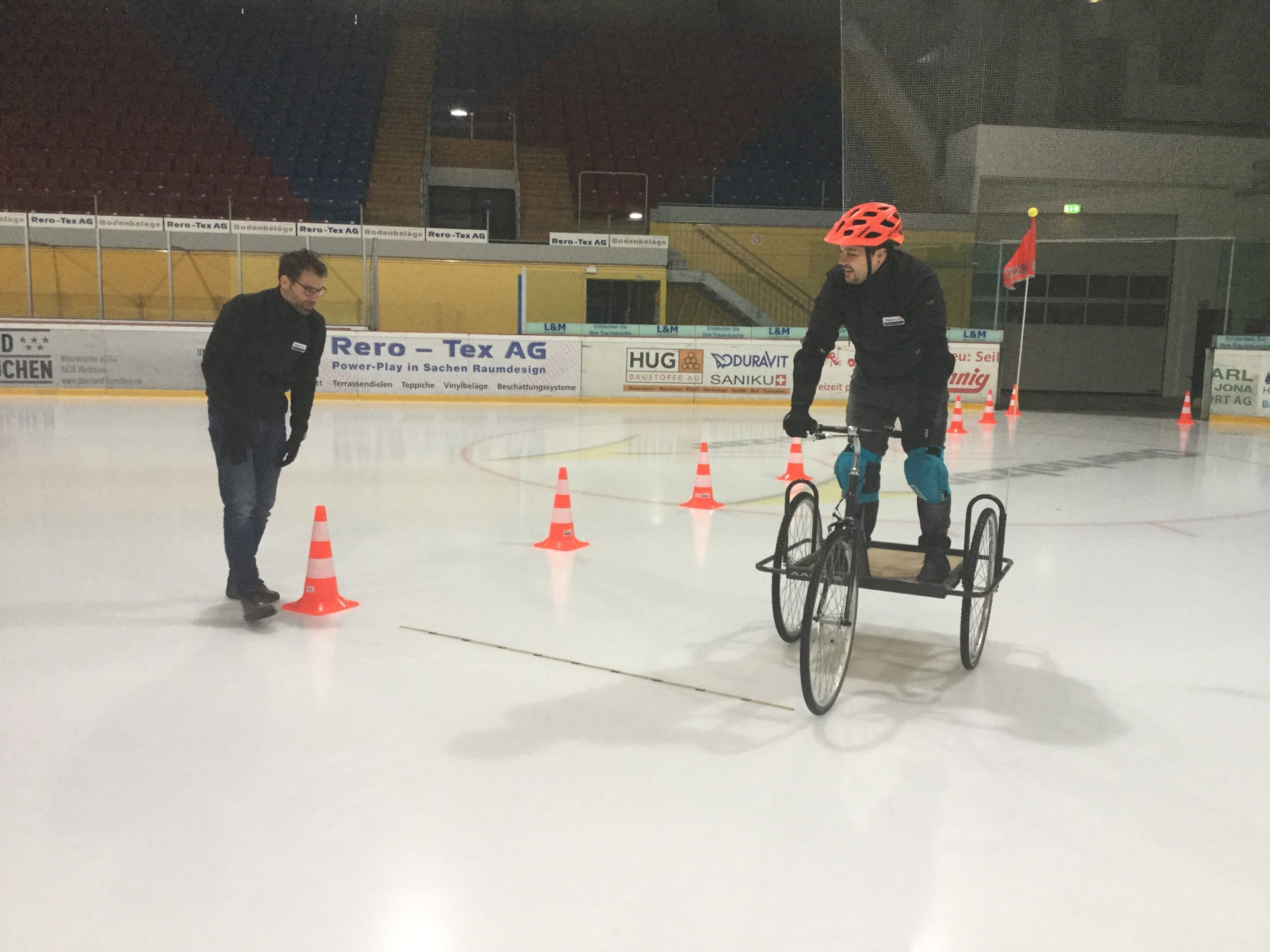 Sommerreifen, Winterreifen ohne Profil, Winterreifen mit Profil und Spikesreifen hat Veloplus Produktmanager, Yves Albrecht auf dem Eis getestet. Konkret wurden die unterschiedlichen Reifen nacheinander an ein Dreirad montiert und es wurde eine Vollbremsung auf der glatten Eisfläche gemacht. Das Tempo vor der Vollbremsung war dabei konstant bei 10 Km/h (gemessen mit Velocomputer). Die Distanz ab Bremsbetätigung bis Stillstand wurde im Anschluss gemessen und auf einen halbe Meter genau gerundet. Ebenfalls bewertet wurde das Kurvenverhalten der einzelnen Reifen. Mit dem Dreirad wurde ein Pylonen-Parcours auf der Eisfläche abgefahren und es wurde nach Gefühl bewertet, wie sich die der Reifen verhält.