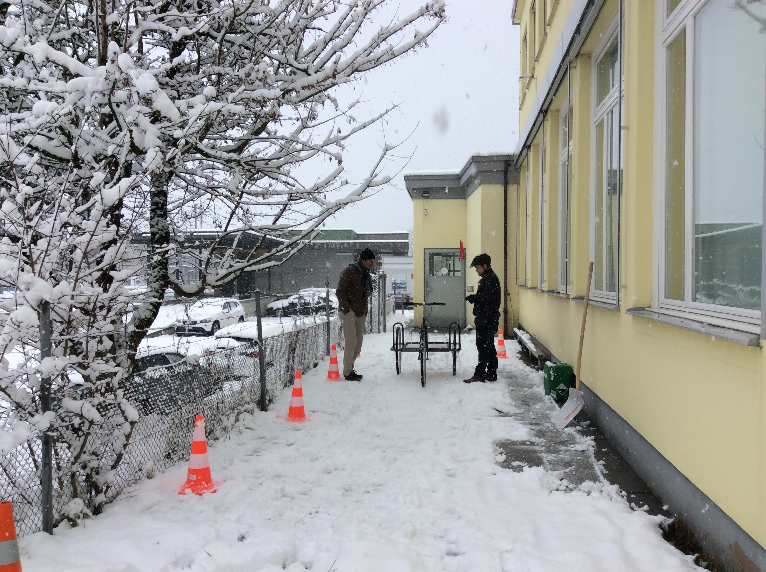 Da es nun die weisse Pracht auch bis in die tiefen Lagen geschafft hat, konnten wir bei uns vor dem Haus in Wetzikon unterschiedliche Sommer-, Winter- und Spikesreifen testen. Wieder haben wir die Pylonen im Abstand von 2 Metern platziert und mit 10 Km/h angeschoben. Beim Bremstest wurde mit einer Geschwindigkeit von 10 km/h – mit einem Dreirad – eine Vollbremsung durchgeführt. Danach wurde die Distanz ab Bremsbetätigung bis Stillstand in Zentimeter genau gemessen. Der Fahrverhalten-Test basiert auf Gefühlswerten durch den Tester.
