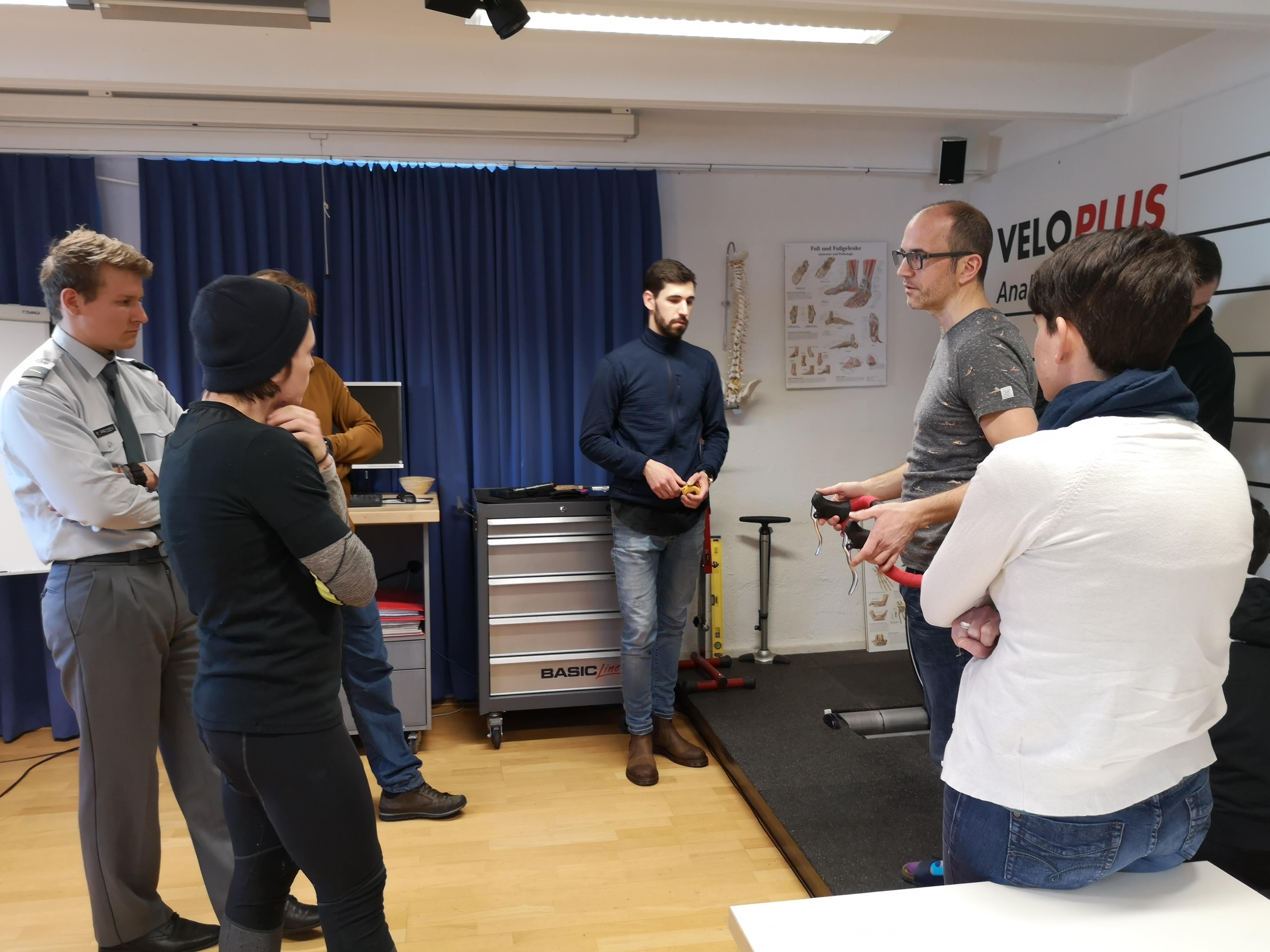 An diesem kühlen Mittwochmorgen stehen alle Teilnehmer der Schulung schon früh bereit. Mit dabei sind eine Detailhandelsfachfrau und sechs Detailhandelsfachmänner aus verschiedenen Veloplus-Läden. Einen ganzen Tag lang werden sie heute ihr Wissen auffrischen und Praxisübungen absolvieren.