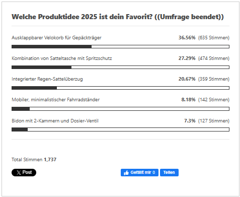 Ihr habt abgestimmt und aus den fünf ausgewählten Ideen eure Lieblingsidee gewählt. Und gewonnen hat der ausklappbare Velokorb für den Gepäckträger. Diese Idee wurde eingesendet von Veloplus-Kundin Sabine, die somit den Preise für die beste Produktidee gewinnt. Der ausklappbare Velokorb hat sich knapp durchgesetzt. Dahinter folgen auf Platz 2 und 3 die Kombination von Satteltasche und Spritzschutz und der integrierte Regen-Sattelüberzug. Wir gratulieren Sabine ganz herzlich zum Preis von einem Veloplus-Gutschein im Wert von 500 Franken.