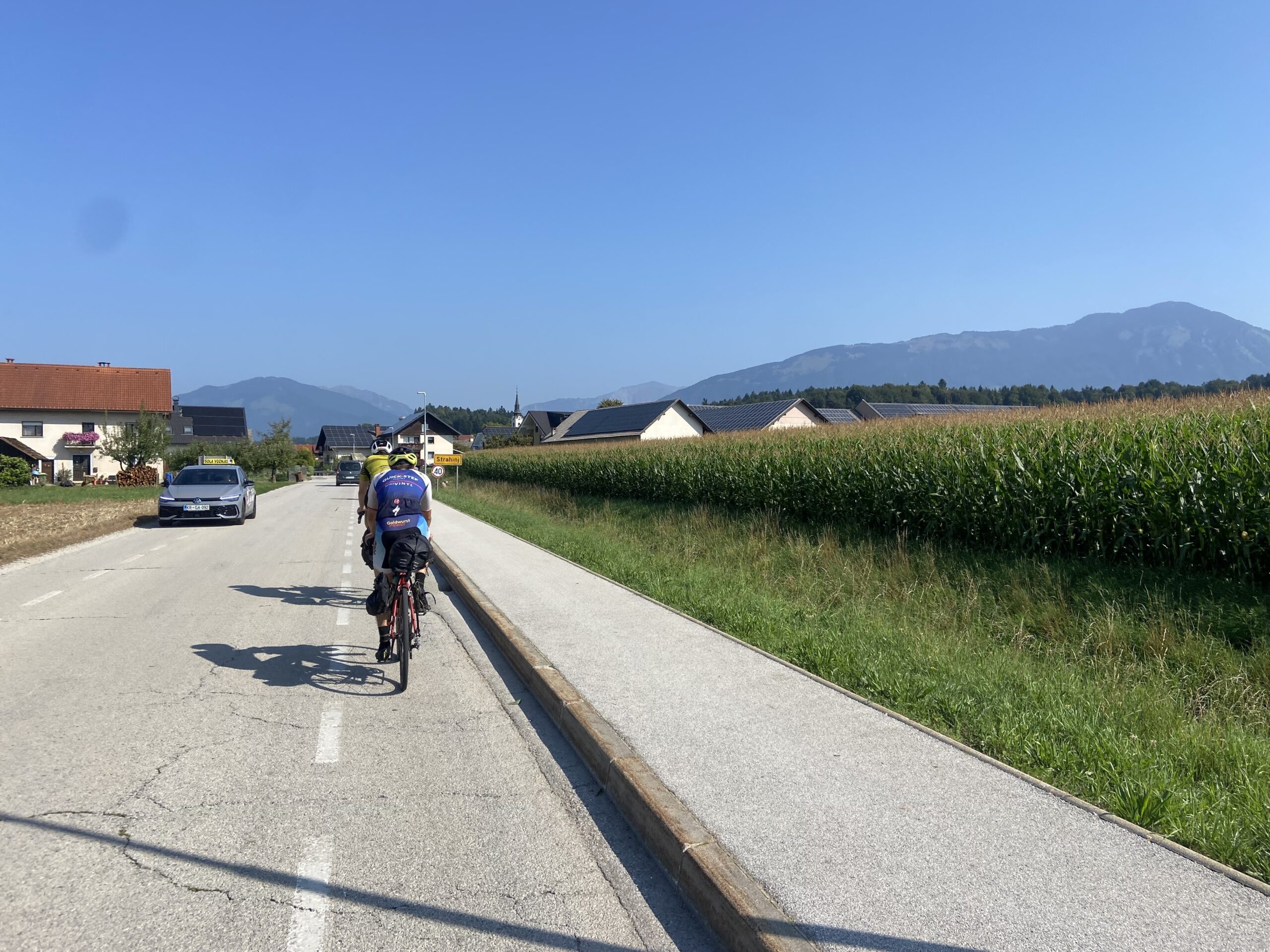 Wir fahren wieder zurück nach Slowenien und rollen durch die malerische Landschaft nach Ljubljana. Hier verbringen wir einen Tag als Touristen und geniessen die gemütliche Stadt. Als wir aus der Stadt hinausfahren, werden wir bei einer Pause von einer Gruppenausfahrt vom «Pogi-Team», dem slowenischen Nachwuchsteam von Tadej Pogačar, überholt. Sofort brechen wir die Pause ab und jagen der Gruppe nach, nur um als wir sie durch grossen Effort eingeholt haben, bei einer Abzweigung in die andere Richtung fahren zu müssen.