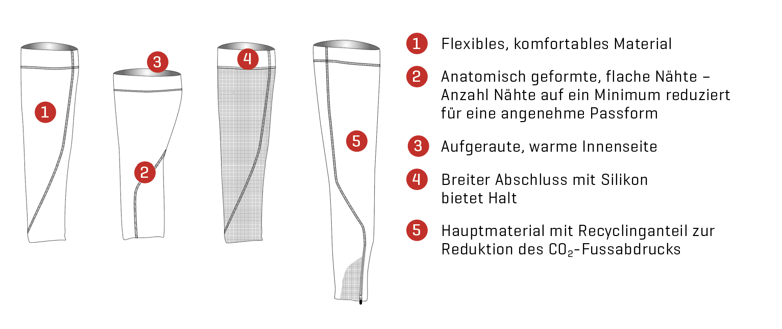 Sehr schnell war klar, dass Komfort, Passform und der Halt unabdingbar sind – da darf unterwegs nichts rutschen. Zudem gehört zur Grundausstattung von Arm-, Bein- und Knielingen, die in der Übergangszeit eingesetzt werden, ein warmes, angenehmes innen aufgerautes Material.