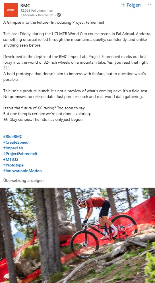 «Ein Vorgeschmack auf morgen», so kündigt BMC sein Project Fahrenheit in einem LinkedIn-Post an. Es sei BMCs erster Vorstoss in die 32-Zoll-Welt. «Ja, 32 Zoll» steht da für alle, die meinen, falsch gelesen zu haben.