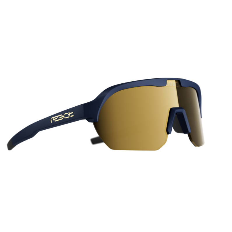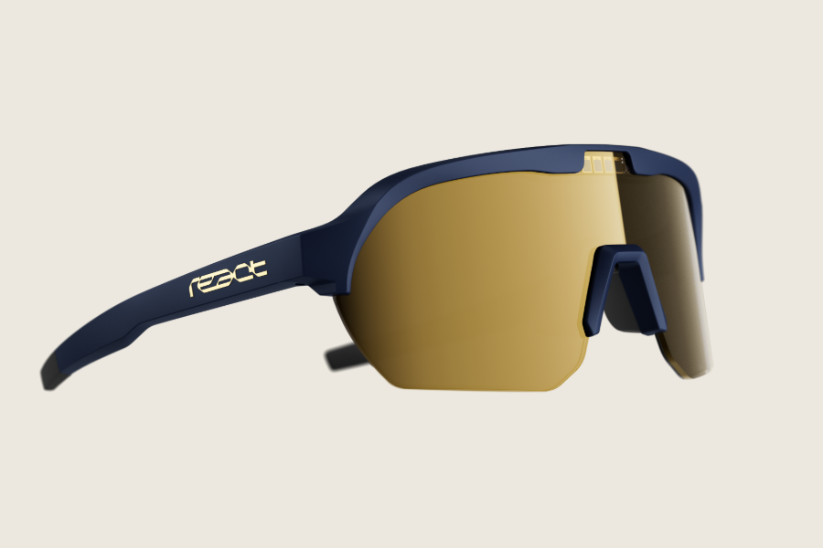 Das Jahr 2026 steht bei Pinarello – Q36.5 ganz im Zeichen der Farben blau und gold. So ist neben dem neuen blau und gold lackierten Pinarello Rennrad Dogma F auch die Sportbrille von react passend dazu mit blauem Rahmen und goldener Verspiegelung auf der Aussenseite.