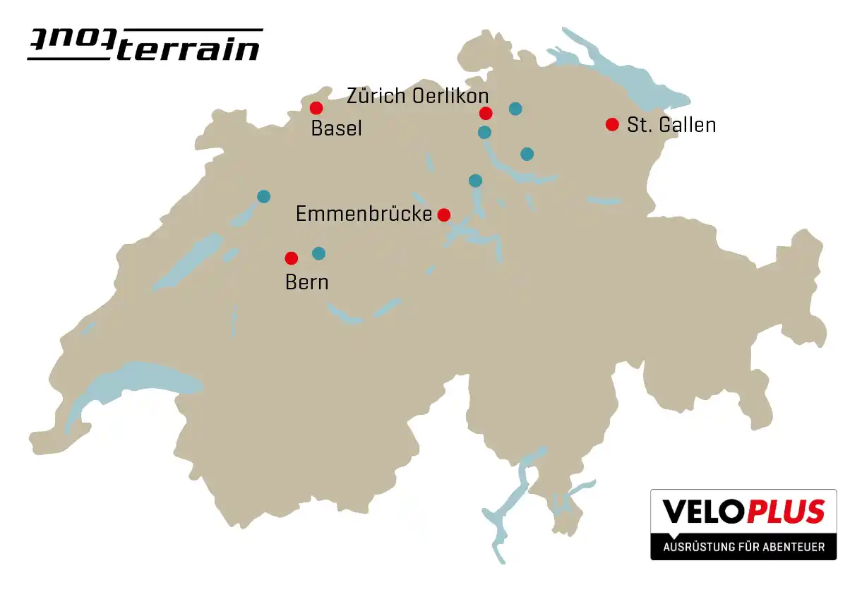 In allen 11 Veloplus-Läden sind Velos von Tout-Terrain konfigurier- und bestellbar. In den fünf Kompetenzzentren Basel, Bern, Emmenbrücke, Zürich-Oerlikon und St. Gallen stehen verschiedene Modelle zur Besichtigung und für eine Probefahrt bereit.