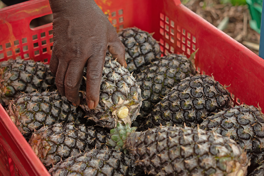 Die getrockneten Ananasstücke von gebana entstehen aus Früchten, die zu klein sind für Ananasringe. gebana bezieht die Bio-Ananas aus Togo und lässt sie direkt vor Ort trocknen und verpacken. Die Ananasstücke aus Togo schmecken süss und gleichzeitig leicht säuerlich. Sie sind weder geschwefelt noch mit Zucker versetzt.